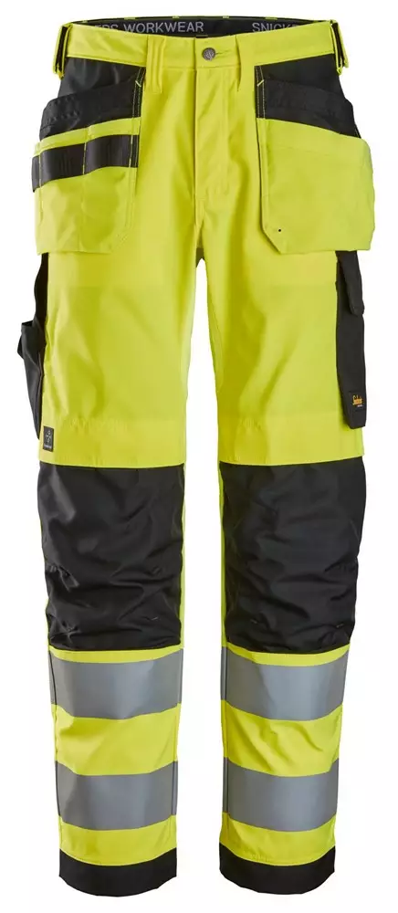 Nämä monipuoliset huomiohousut on suunniteltu rakennus-, tienrakennus- ja kuljetusalan ammattilaisille, ja ne tarjoavat luokan 2 näkyvyyttä turvallisuuden takaamiseksi heikossa valaistuksessa. Muotoon ommellut lahkeet, joustava haarakappale ja takana olevat stretch-kaitaleet tarjoavat mukavaa istuvuutta ja rajoittamatonta liikkuvuutta. Housuissa on CORDURA®-vahvistetut polvitaskut sekä useita vahvistettuja taskuja, jotka lisäävät käytännöllisyyttä: kaksi riipputaskua, jotka helpottavat tärkeiden työkalujen käyttöä, mittatasku, jossa on kynätasku ja puukonpidike, sekä reisitasku, jossa on vielä kaksi kynätaskua ja henkilökorttipidike. Tarranauhakiinnitteiset työkalunpidikkeet molemmin puolin lisäävät käyttömukavuutta lisätarvikkeita kuljetettaessa, kun taas paikkatakataskut tuottavat siistin ilmeen.