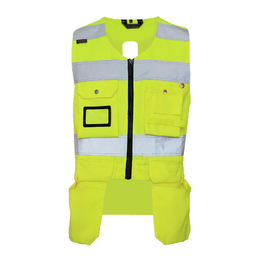 Huomiovärinen riipputaskuliivi, jossa on paljon taskuja sekä uusia lenkkejä ja nappeja työkaluille ja esimerkiksi vasaralle. Fluerisoiva keltainen väri näkyy kauas päivänvalossa ja hämärässä. Heijastinnauhat antavat käyttäjälleen turvan pimeän aikaan.
