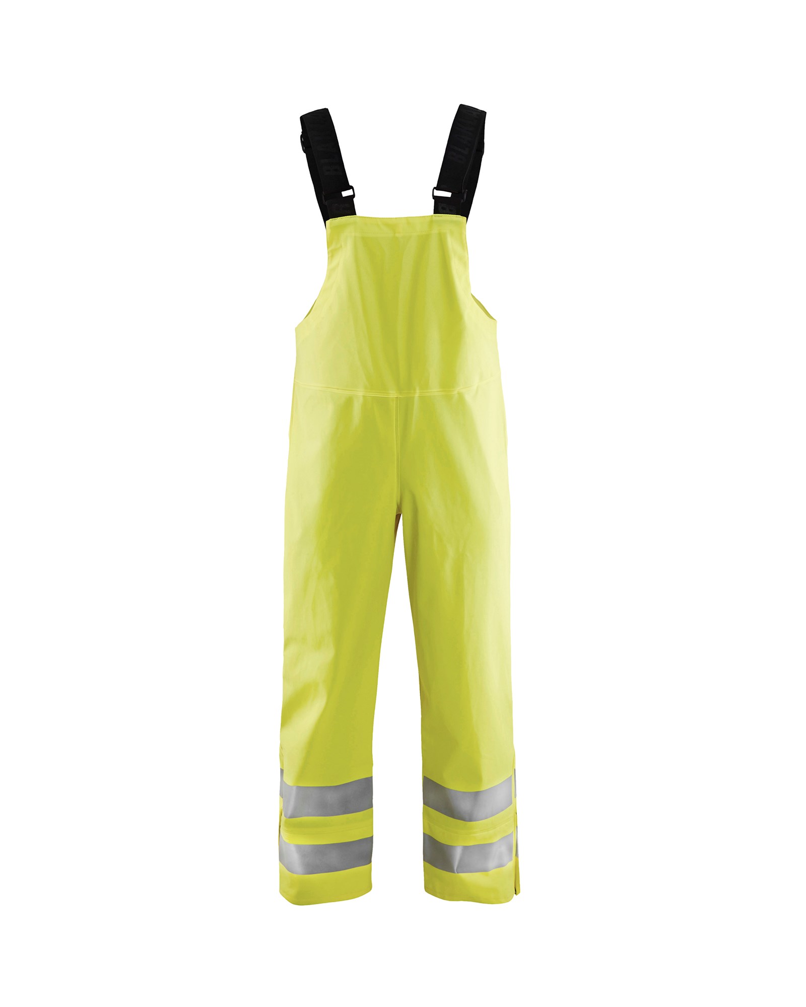 Huomioväriset sadehousut työtehtäviin, jotka vaativat erittäin kestäviä sadevaatteita. Housut ovat tuulen- ja vedenpitävät, liimatuilla saumoilla. Hyvä istuvuus napeilla säädetävällä vyötäröllä, säädettävillä ja joustavilla henkseleillä ja napeilla säädettävillä lahkeensuilla.