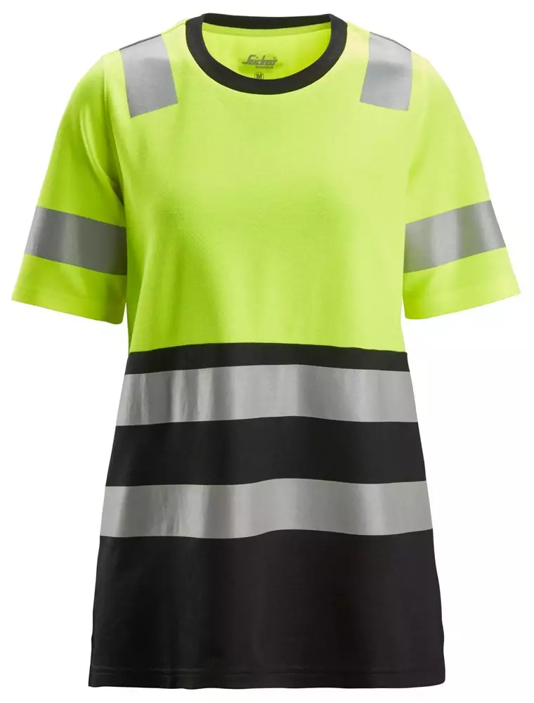 Naisten huomio-t-paita, jossa on mukava puuvillapinta sisäpuolella ja joustavat painetut heijastinnauhat ulkopuolella.