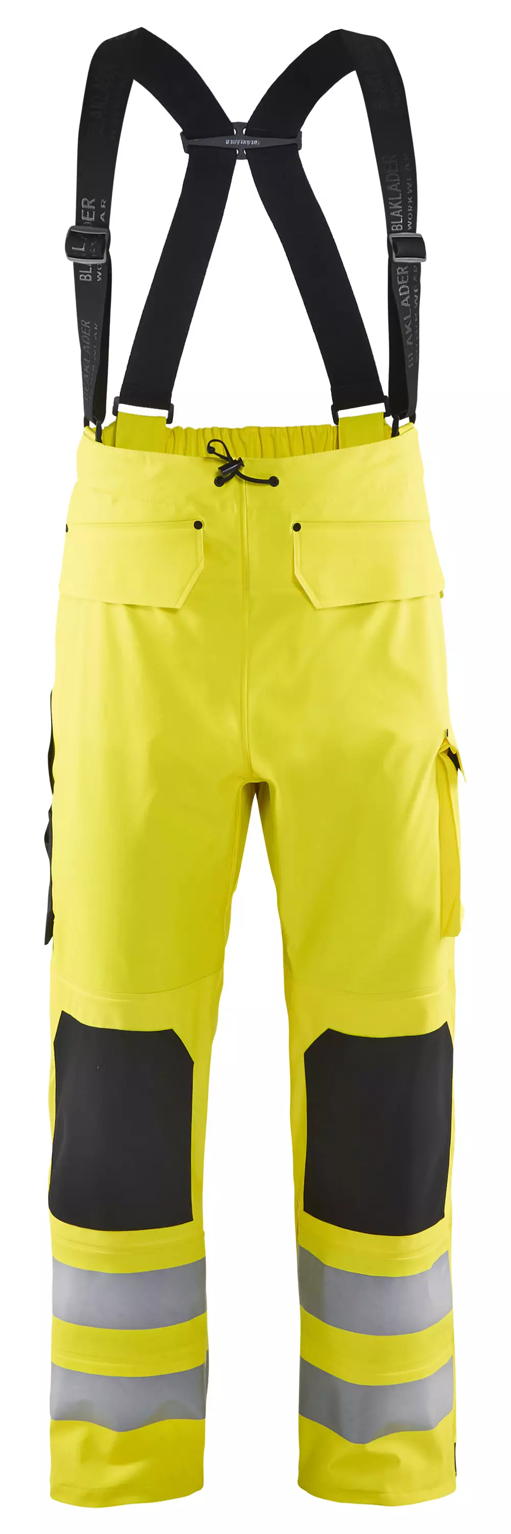 Hengittävät, tuulen- ja vedenpitävät varoitussadehousut liimatuilla saumoilla, joissa on säädettävät, irrotettavat ja joustavat henkselit. Kiristysnauhalla säädettävä vyötärö ja leveä resori selässä. Housujen polvet sekä lahkeiden takaosat on vahvistettu. Housuissa on kätevät taskut ja 65mm leveät heijastimet lahkeiden ympärillä antavat lisää näkyvyyttä. Riipputaskut on mahdollista saada esiin alla olevista housuista.