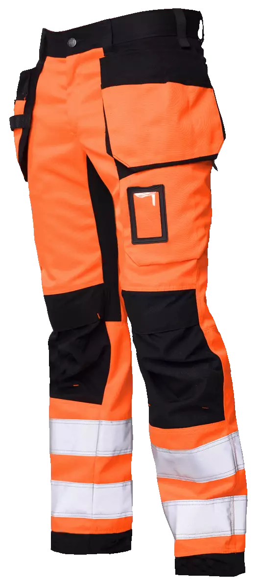 Toimivat ja kestävät varoitusriipputaskuhousut, jotka ovat valmistettu hengittävästä materiaalista. Kankaan liukkaan pinnan vuoksi pöly ja lika ei tartu. Joustopaneelit haarassa, takapuolessa ja sivutaskuissa. Tilavissa riipputaskuissa on työkalupidikkeet sekä pienet ruuvitaskut. Mittataskussa paikat kahdelle puukolle ja mattoveitselle. Vyötäröllä vasaralenkki. Vetoketjulla suljettava reisitasku, jossa ID-korttitasku ja sisäpuolella kännykkätasku. Polvissa säädettävät polvisuojataskut. Polvisuojataskut, riipputaskut ja lahkeensuut ovat kulutusta kestävää Corduraa.
