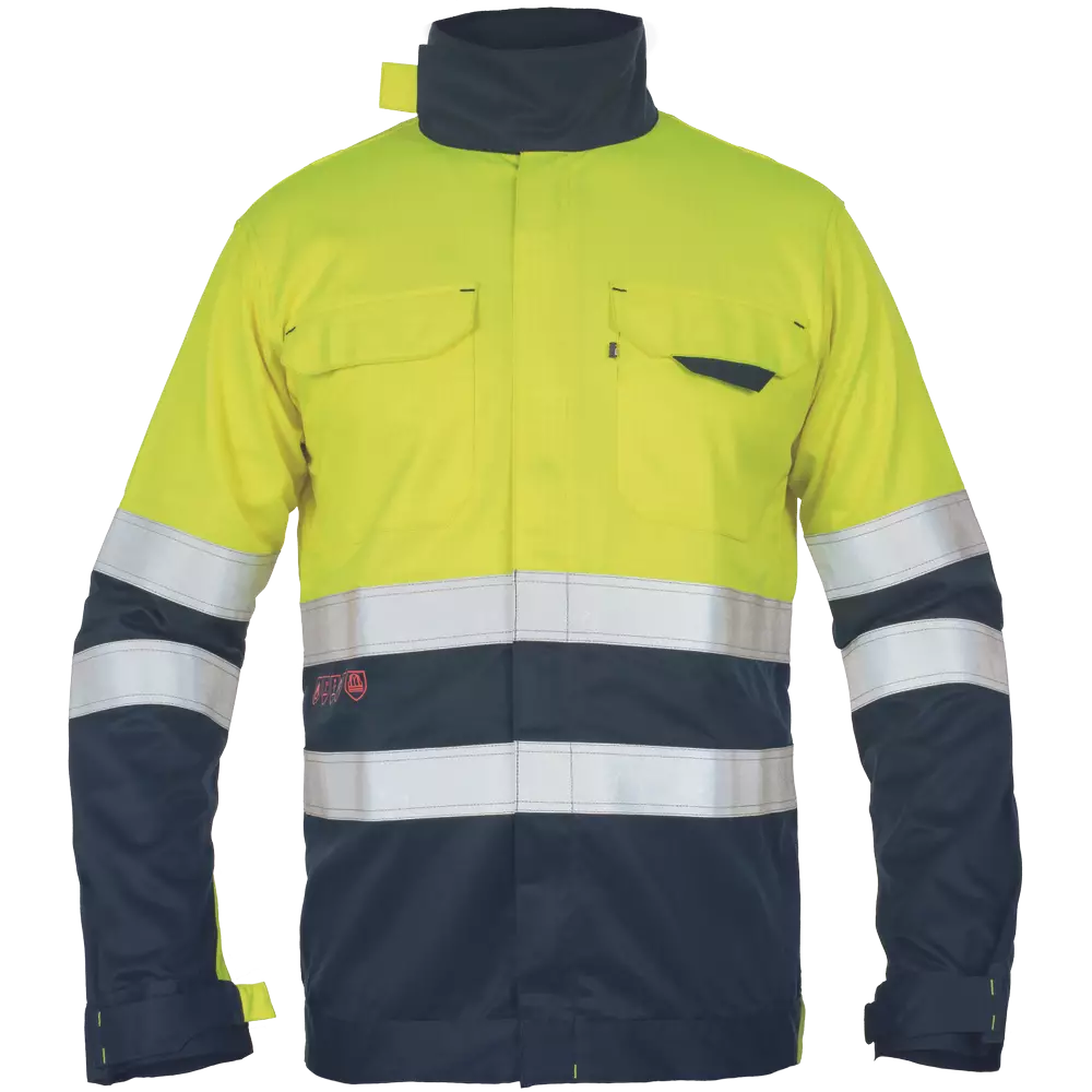 Multinorm takki, jossa vetoketjullinen suljin tarranauhalla sekä 2 rintataskua tarranauhalla. Lisäksi 5cm heijastinnauhat hihojen ja lantion ympärillä ja tarranauhasäätö hihansuissa sekä pystykaulus.