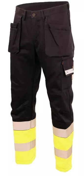 Joustovyötäröllä varustetut riipputaskuhousut, joissa yhdistyvät näkyvän, palosuojatun ja antistaattisen vaatteen standardoidut vaatimukset. Edessä olevat riipputaskut saa tarvittaessa piilotettua housun sisään taskujen alla olevien vaakaviiltojen ansiosta.