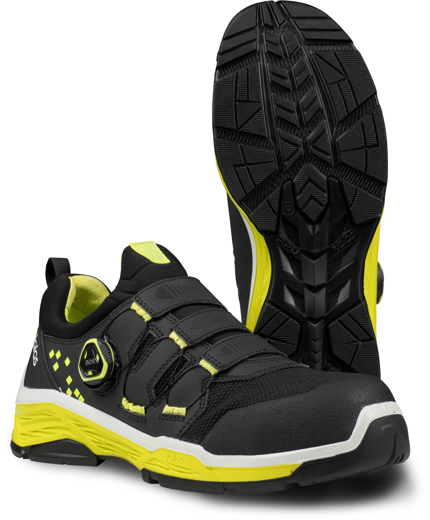 Pehmeä ja vettähylkivä turvajalkine, joka tarjoaa tehokasta suojaa. Parasta pehmeyttä ja käyttömukavuutta pehmeän ja vakaan TIO (Three In One) -ulkopohjan ansiosta, joka estää pitkäaikaisten jalka- ja selkävammojen syntymisen. Kolmipaneelinen BOA-kiinnitysjärjestelmä mahdollistaa pehmeän, täydellisen ja yksilöllisen istuvuuden. Jalkineessa on alumiininen varvassuoja ja pehmeä tekstiilinen naulaanastumissuoja. Uusi Jalas-teknologia, jossa kolme pohjaa yhdessä.