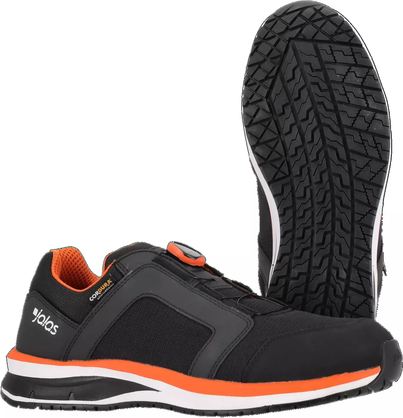 Tyylikäs ja kevyt turvajalkine, jossa on BOA® Fit System nopeaa säätöä ja tiukkaa istuvuutta varten. Päällinen on valmistettu 100-prosenttisesti kierrätetystä Cordura® re/cor™-polyesteristä, jossa on PFAS-vapaa vettähylkivä viimeistely. Tämä kestävä mutta hengittävä kangas pitää jalat mukavan tuntuisina ja kuivina kevyesti kosteissa ympäristöissä. Poron® XRD® -pohjallinen tarjoaa edistyksellisen iskunvaimennuksen, kun taas EVA-/nitriiliulkopohja takaa pidon ja hyvän liukastumisen eston. Ominaisuuksiin kuuluvat metallinen varvassuoja, pehmeä naulaanastumissuoja ja ESD-hyväksyntä.