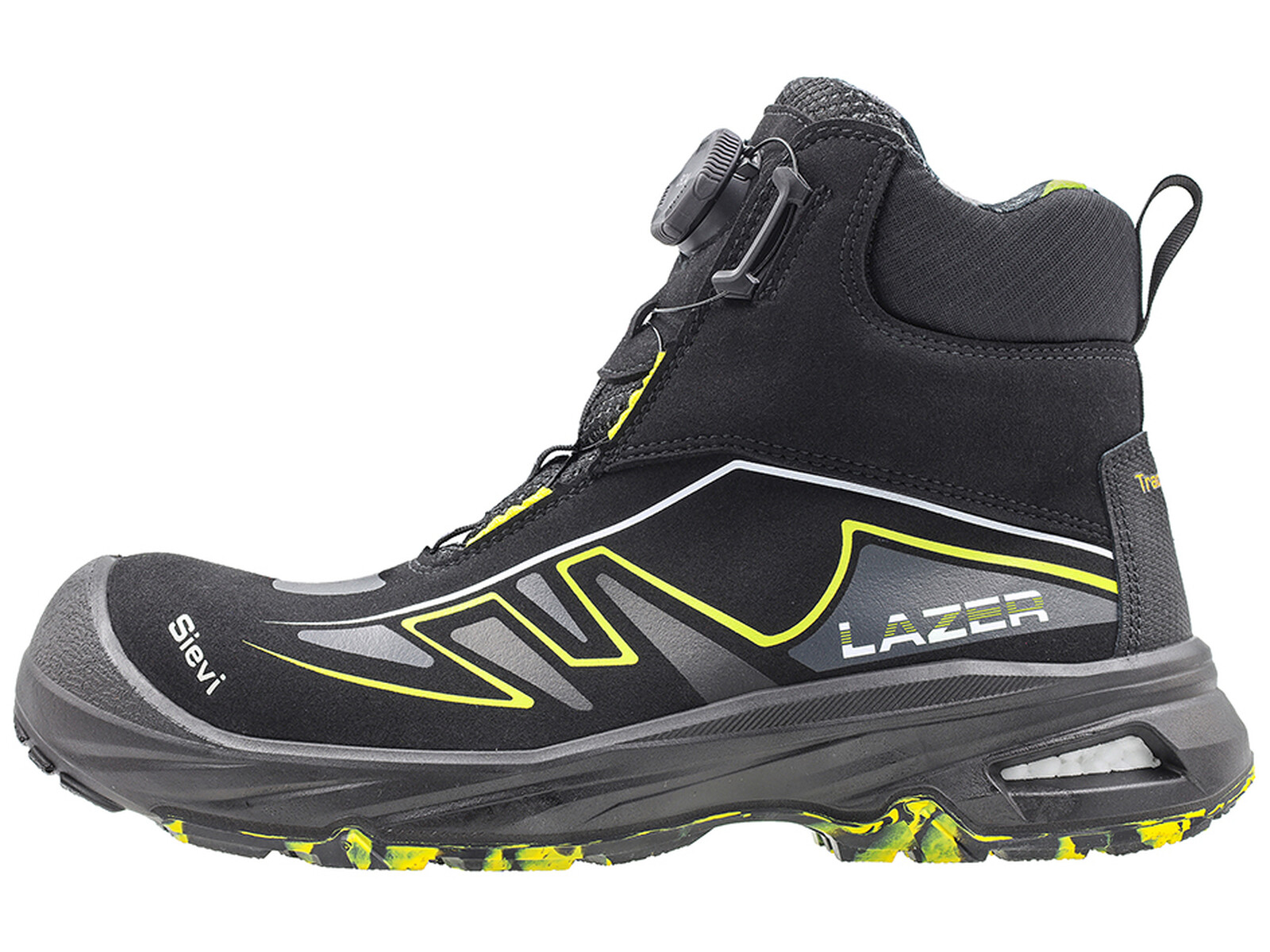 Lazer Roller High+ nilkkurissa on aukollinen kantarakenne. FlexEnergy®-joustoelementti näkyy jalkineen kannassa olevista aukoista, jotka mahdollistavat elementille suuremman liikkuvuuden lisäten näin jalkineen edistyksellistä joustavuutta. Pidon varmistaa Sievi TractionPro®-kitkapohja. Nilkkaosassa on PORON XRD® tuki, joka myötäilee jalkaa, tukee nilkkaa sekä vaimentaa siihen kohdistuvia iskuja. Jalkineet soveltuvat käytettäväksi myös kuumissa olosuhteissa. Sievin nitriilikumista valmistettu kitkapohja kestää kuumuutta 300 °C asti. ESD-hyväksytty. Komposiittinen varvassuoja ja teräksinen naulaanastumissuoja.