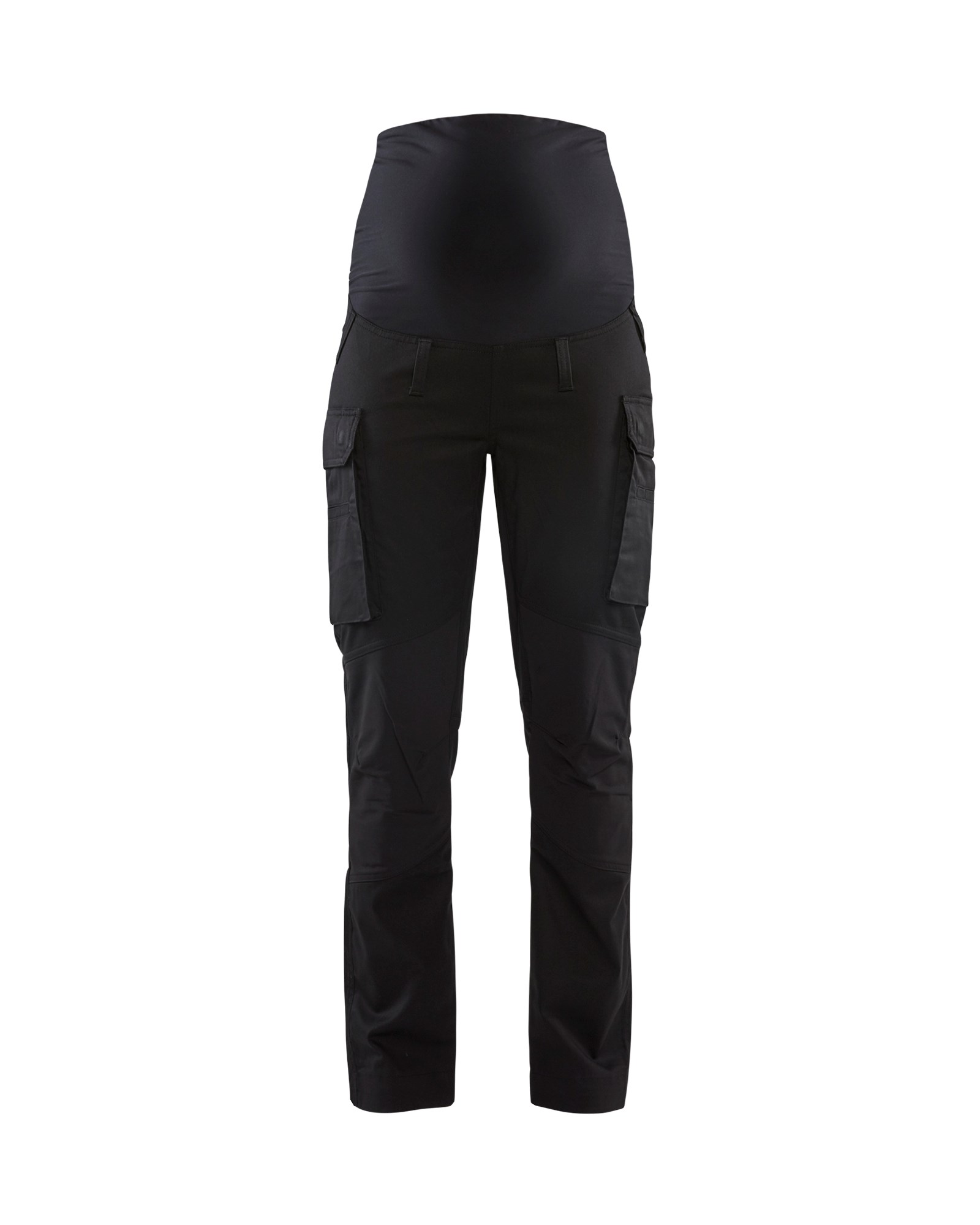 Äitiyshousut kahteen suuntaan joustavasta kankaasta, neljään suuntaan joustavilla osioilla takana, haaroissa ja polvissa. Taskuissa on magneettinen nappi vetoketjun sijaan, eli ne eivät naarmuta. Vyölenkit vyötäröllä, joihin voi kiinnittää irralliset riipputaskut.