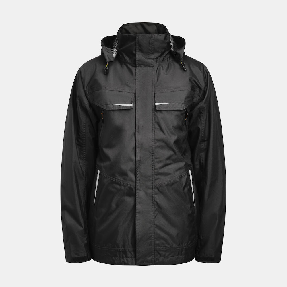 Tuulen- ja vedenpitävä kuoritakki, jossa teipatut saumat. Edessä kaksisuuntainen vetoketju ja tuulelta ja vedeltä suojaava lista, jossa painonappikiinnitys. Kaksinkertaiset rintataskut, joista kahdessa läppä ja tarrakiinnitys ja kahdessa vedenpitävä vetoketju. Vasemmalla lenkki ID-kortille. Sivutaskuissa vetoketjut ja fleecevuori. Kolme suurta sisätaskua, joista kahdessa vetoketjut. Irrotettava, kiristysnauhalla säädettävä huppu. Tarrakiinnityksellä säädettävät hihansuut ja kiristysnauhalla säädettävä vyötärö.