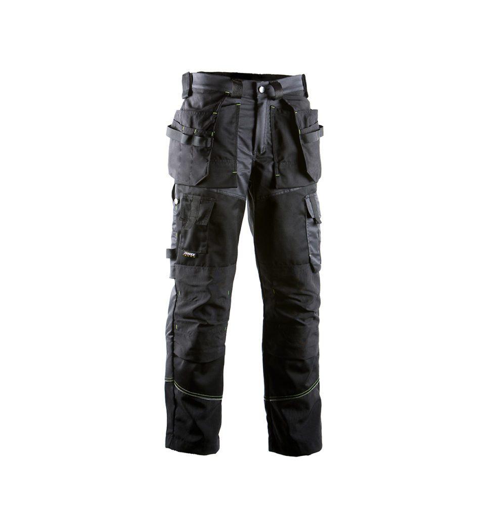 Cordura vahvikkeet etutaskuissa, polvisuojataskuissa ja lahkeissa. Tuplariipputaskut edessä Corduraa. Etutaskujen pohja vahvistettu Corduralla. Reisitasku, esiinotettava vaaka/ pysty henkilökorttitasku. Kynätaskut, puhelintasku ja takataskut. Cordura-polvisuojataskuissa kaksi eri korkeutta polvisuojalle. Vasaralenkit, mittatasku, tarvikelenkit, puukkonappi ja -lenkki. Heijastimet lahkeissa. Valmiiksi huoliteltu 5 cm pidennysvara.