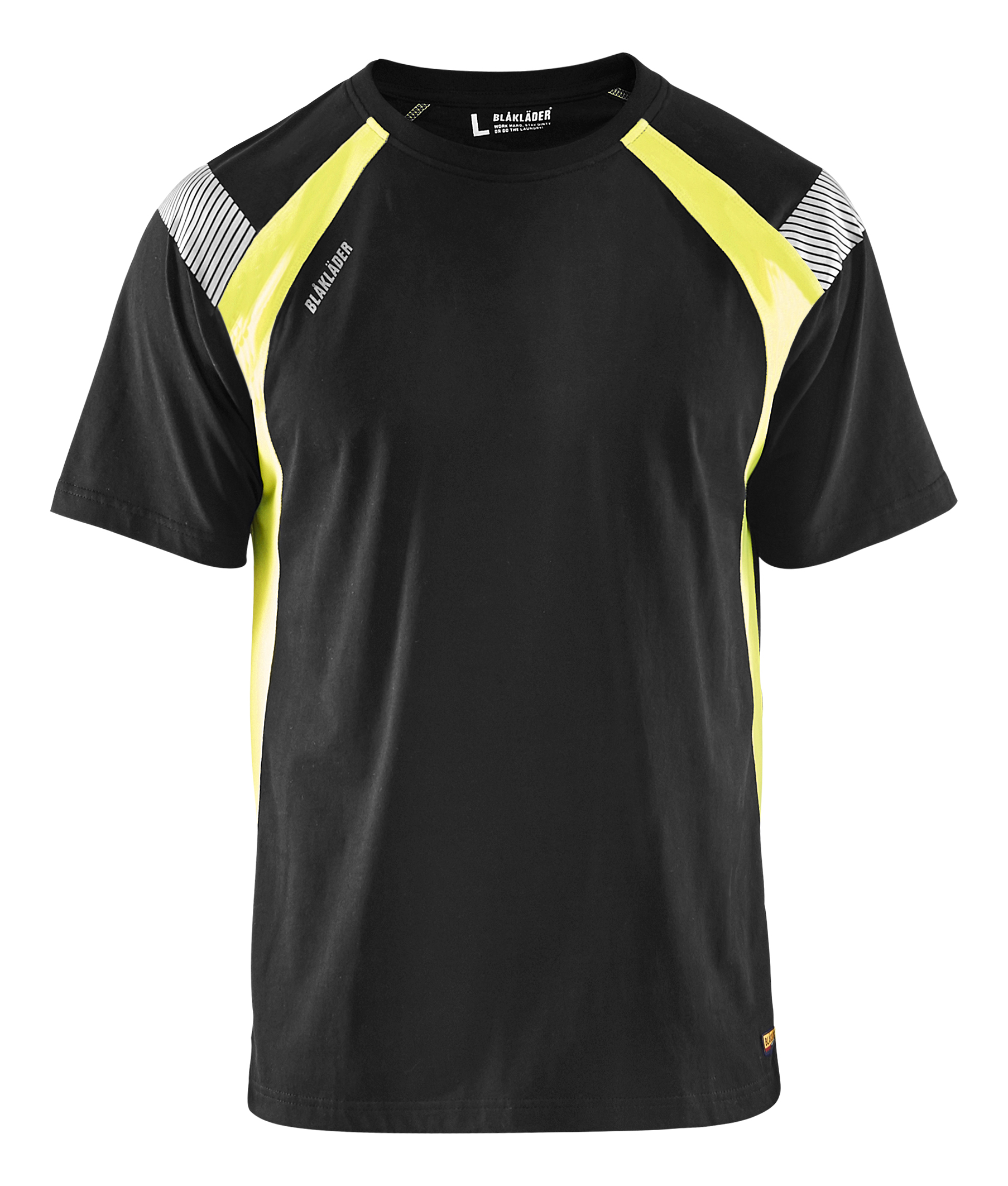 Näkyvä t-paita pyöreällä pääntiellä. Huomioväritetyt yksityiskohdat sekä 50 mm heijastimet tuovat käyttäjälle lisää turvallisuutta ja näkyvyyttä.